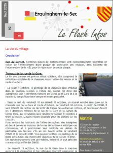 Chaque mois, vous recevez le Flash infos, présentant les dernières actualités du village, dans votre boîte aux lettres. Vous pouvez les télécharger ici :